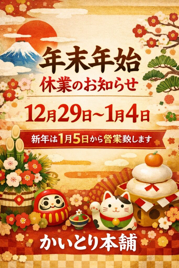 12月29日〜1月4日 の期間、年末年始休業とさせていただきます。